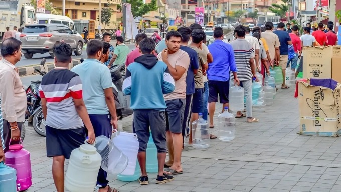 Người dân xếp hàng lấy nước uống tại Rajarajeshwarinagar, ngoại ô Bengaluru. Ảnh: Jithendra M/India Express