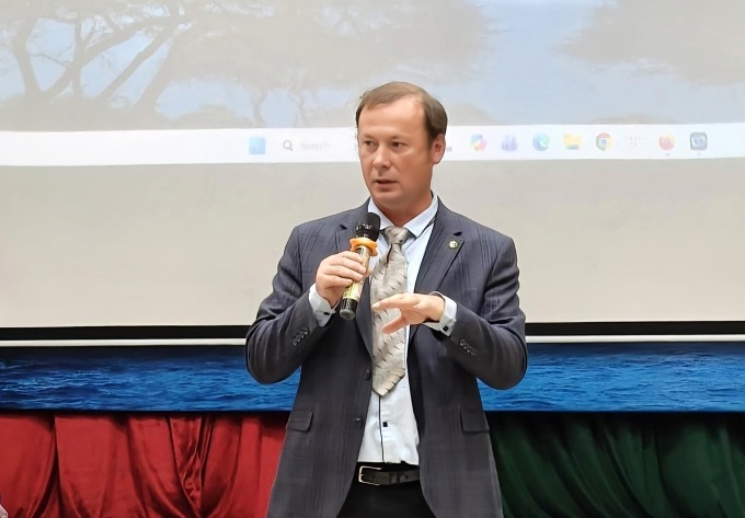PGS.TS Renat Shakirov, trưởng đoàn khảo sát khoa học Nga, kể về chuyến đi của tàu nghiên cứu mang tên Viện sĩ M.A. Lavrientiev sáng 21/11. Ảnh: Trọng Đạt
