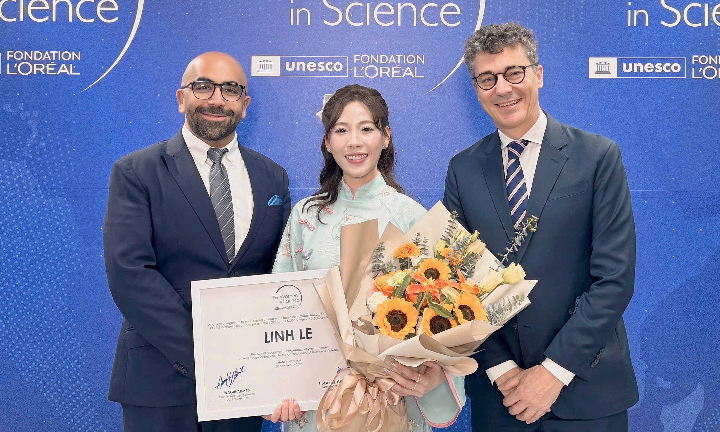 Linh nhận giải thưởng L'Oréal–UNESCO Vì sự phát triển phụ nữ trong khoa học 2025. Ảnh: Nhân vật cung cấp