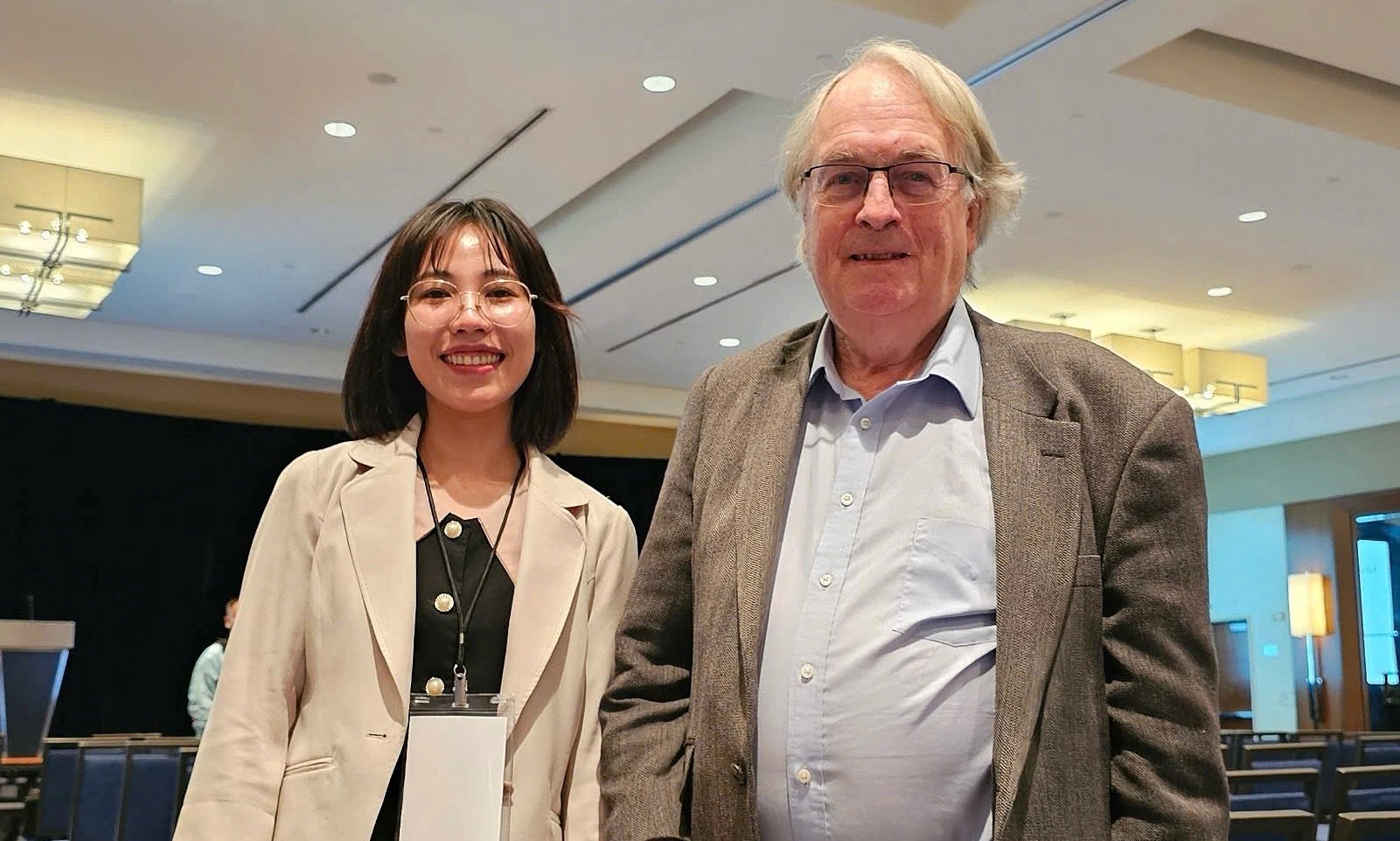 Linh Le cùng Giáo sư Stanley Whittingham, chủ nhân Giải Nobel Hóa học năm 2019. Ảnh: Nhân vật cung cấp