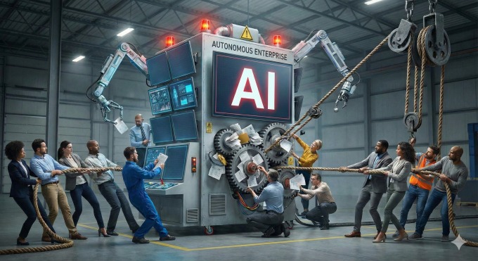 Minh họa sự giằng co công việc giữa AI và con người. Ảnh: Gemini